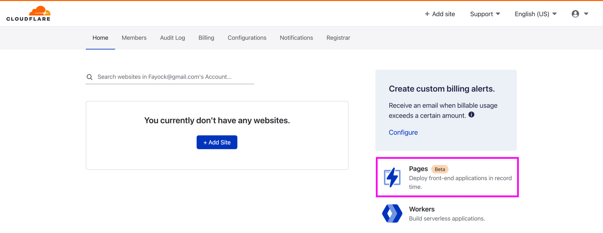 Once we’re logged into the Cloudflare dashboard, we can navigate to the Pages section.